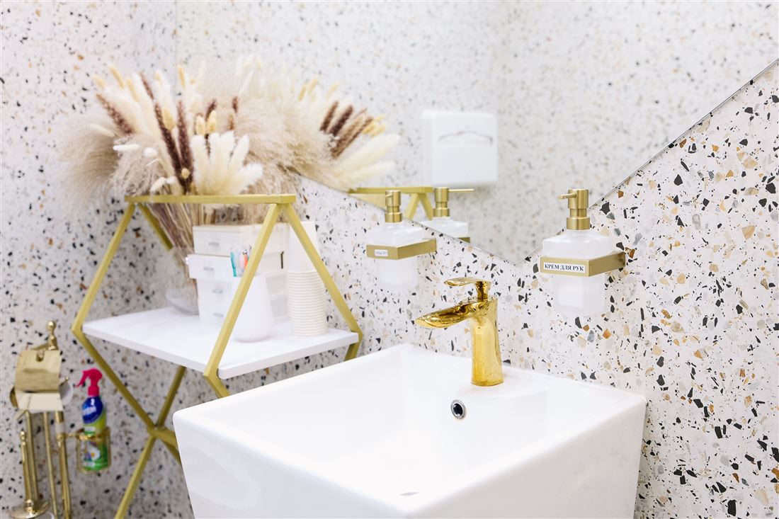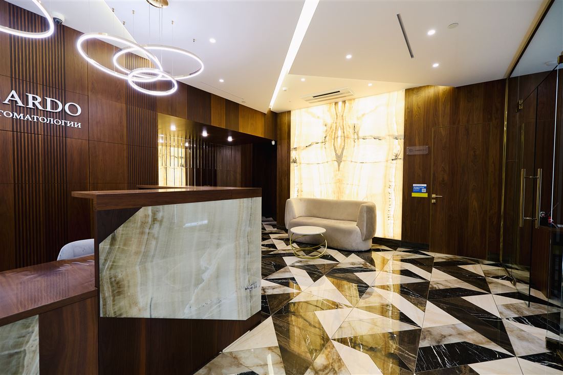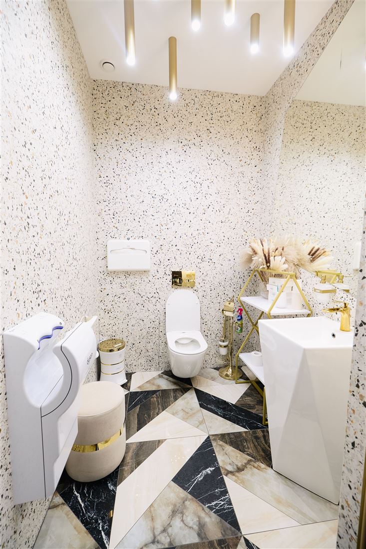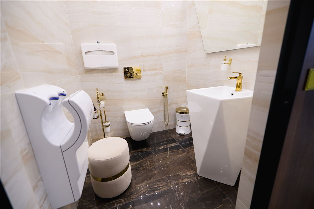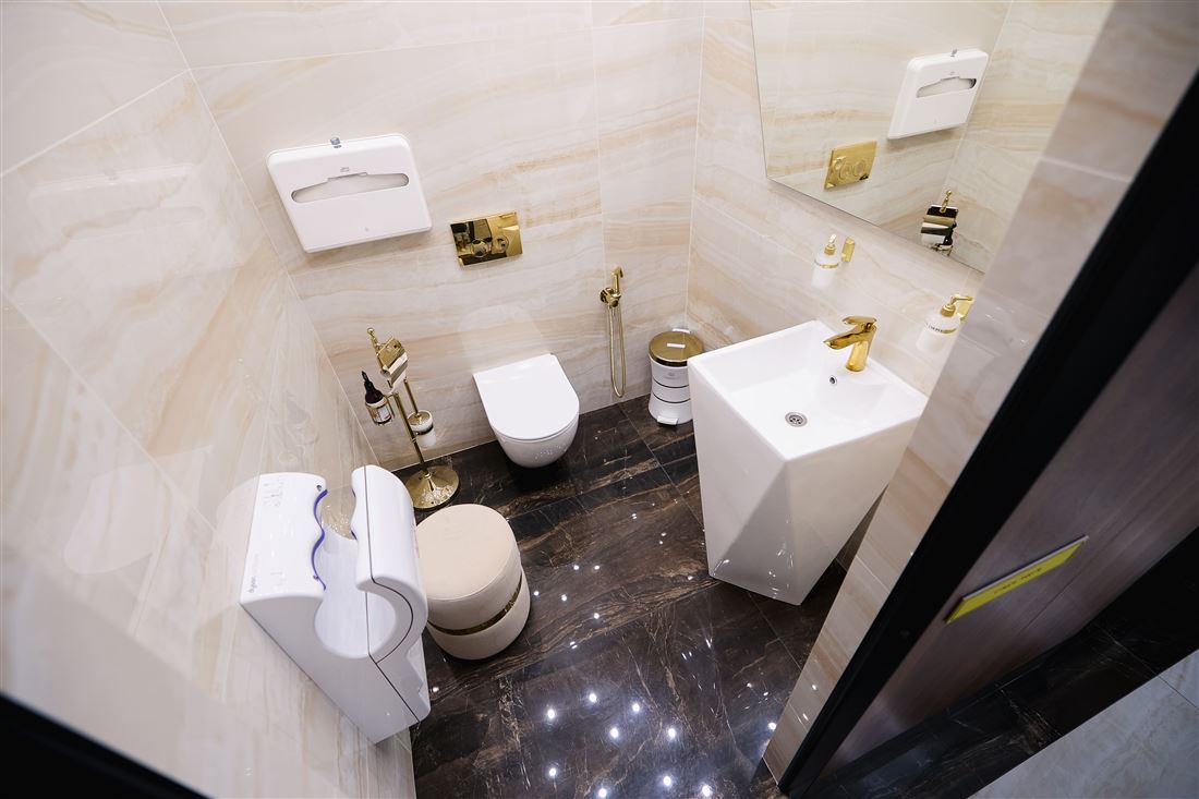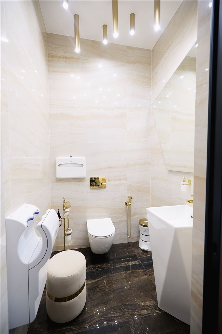 Ох, ребята, вы бы только видели эту красоту! Здесь всё продумано до мелочей: полы и стены из шикарного испанского керамогранита, элегантные стеклянные перегородки, мебель, созданная по индивидуальному проекту, потрясающее панно из натурального оникса и современное освещение.