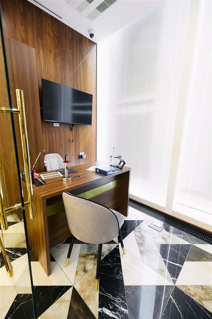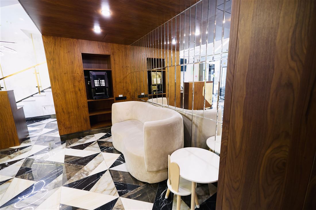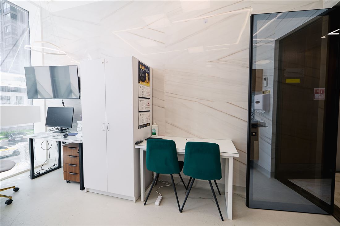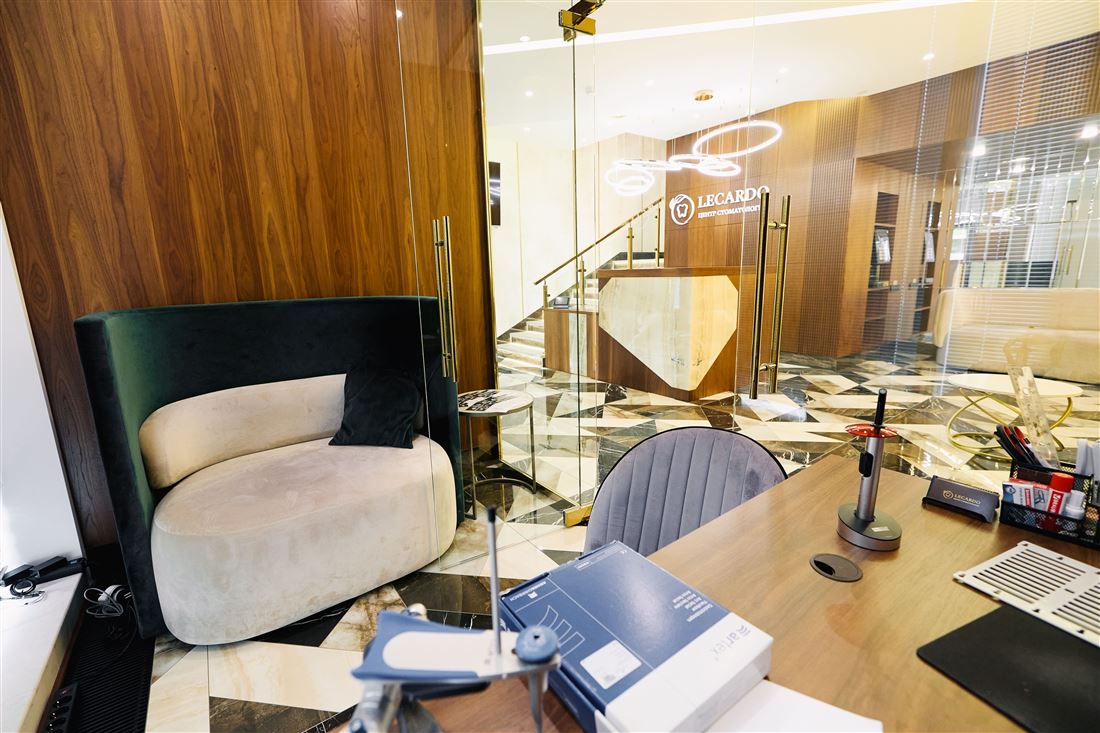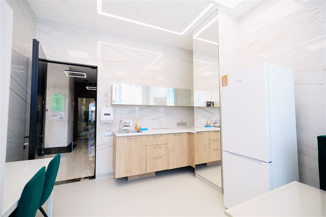 На первом этаже вас ждёт уютный ресепшен, комфортная зона ожидания для клиентов, удобные кабинеты, переговорная комната и всё необходимое для работы. А на втором этаже — дополнительный ресепшен, просторный холл, рабочие кабинеты и даже специальный рентген-кабинет!