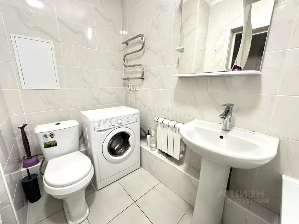 Просторный совмещенный санузел оборудован всей необходимой сантехникой, установлены ванна, стиральная машина, электрический полотенцесушитель.
