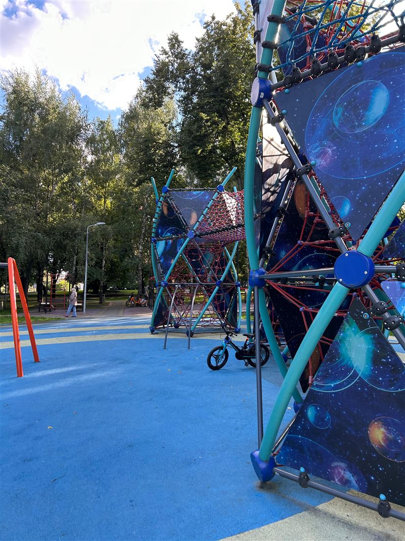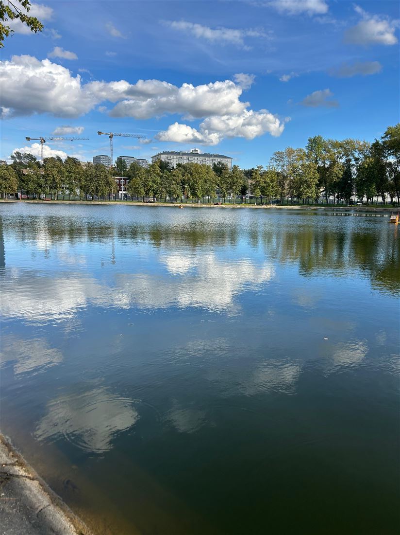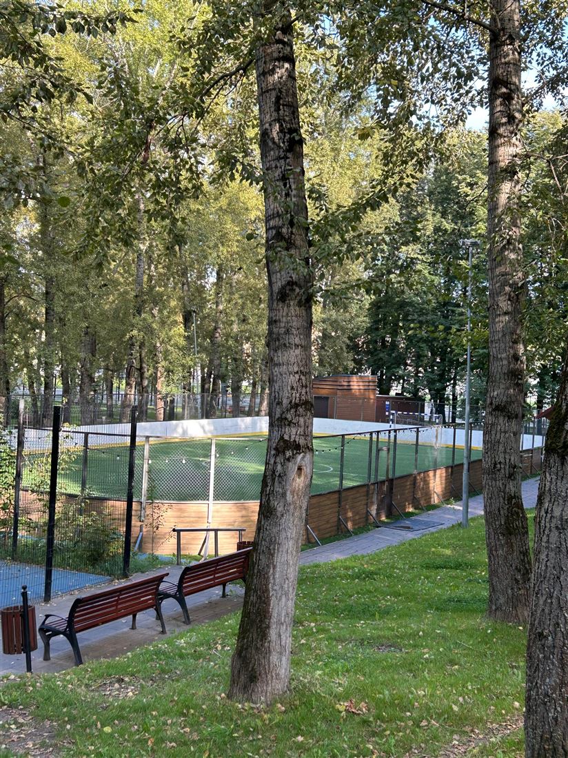 Благоустроенная набережная, на берегу которого расположены: дорожки для пробежек, тренажеры на открытом воздухе, волейбольная площадка, спортивная площадка, два футбольных поля (зимой на одном из них заливают каток) , теннисные столы, баскетбольная школа "Тринта".