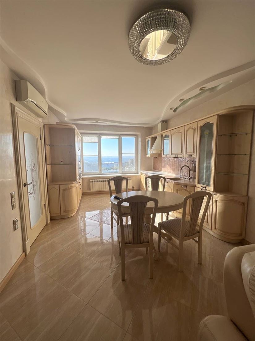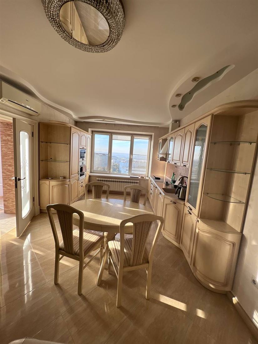 В кухне большой угловой диван из натуральной кожи, бытовая техника Bosh (микроволновая печь, духовой шкаф, варочная панель, посудомоечная машина, вытяжка, кондиционер), стол с шестью стульями.