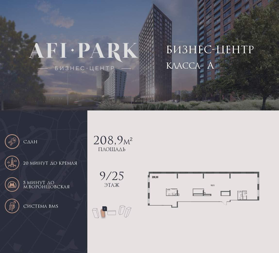 Продается просторное коммерческое помещение общей площадью 208,9 на 9 этаже в готовом бизнес-центре AFI Park. Строительство комплекса завершено.