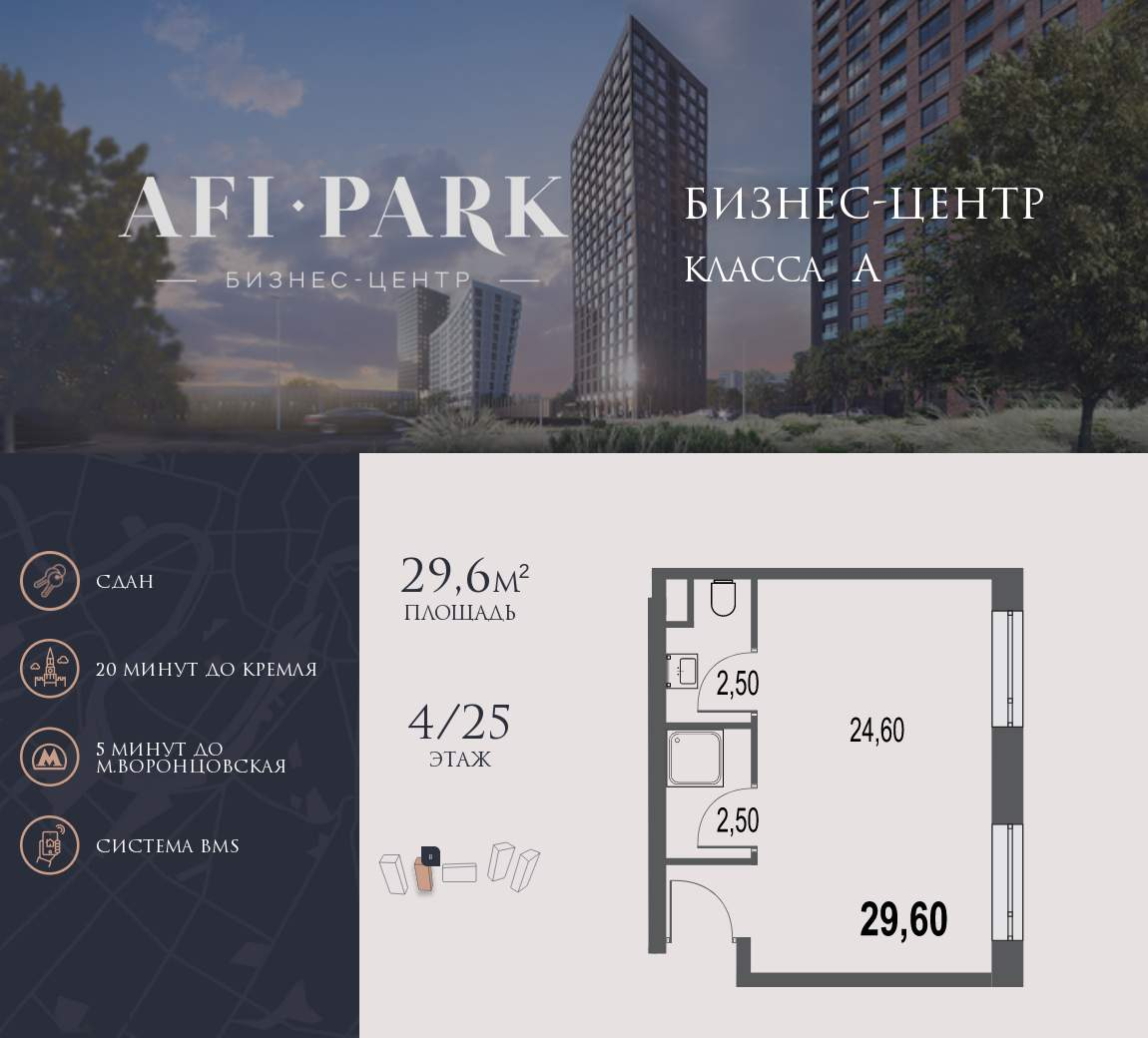 Продается просторное коммерческое помещение общей площадью 29,6 на 4 этаже в готовом бизнес-центре AFI Park. Строительство комплекса завершено.