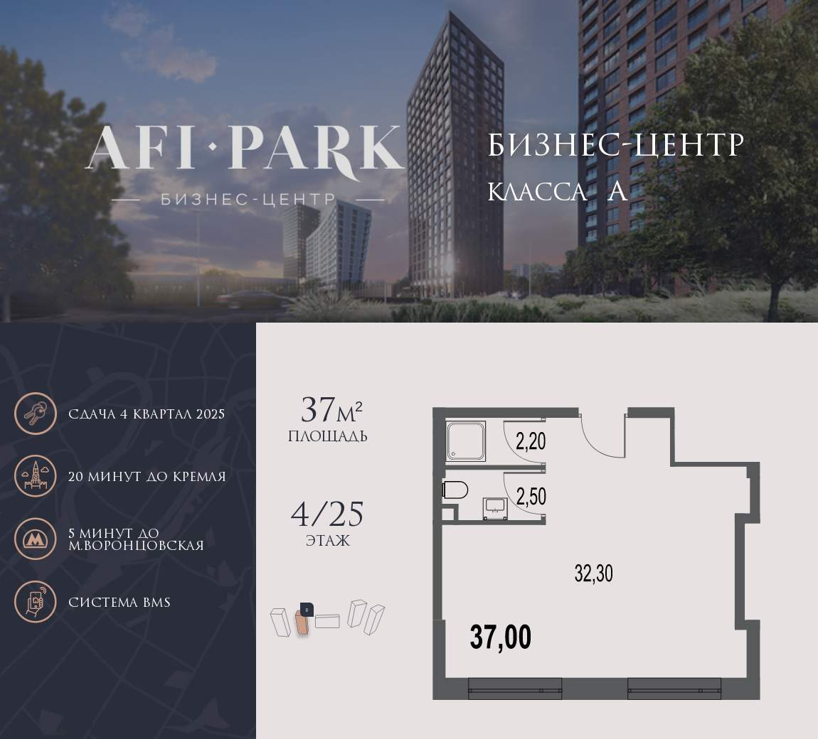 Продается просторное коммерческое помещение общей площадью 37 м2 на 4 этаже в строящемся бизнес-центре AFI Park.
