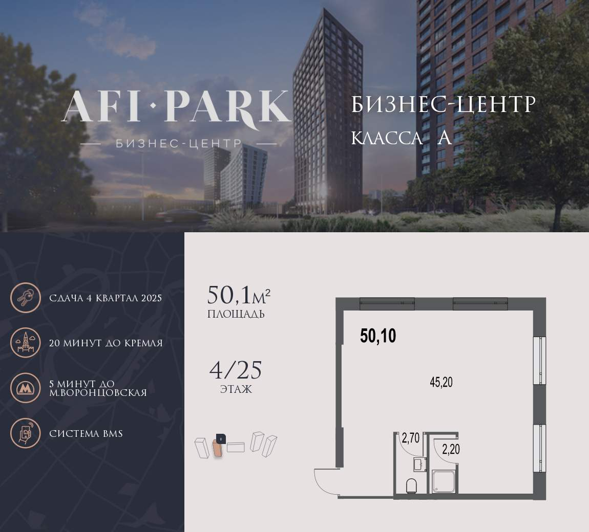 Продается просторное коммерческое помещение общей площадью 50,1 м2 на 4 этаже в строящемся бизнес-центре AFI Park.