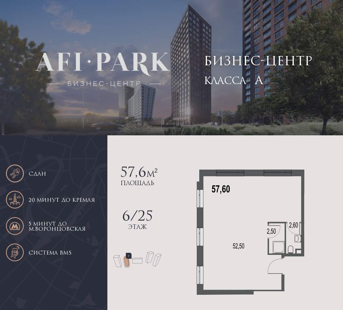 Продается просторное коммерческое помещение общей площадью 57,6 на 6 этаже в готовом бизнес-центре AFI Park. Строительство комплекса завершено.