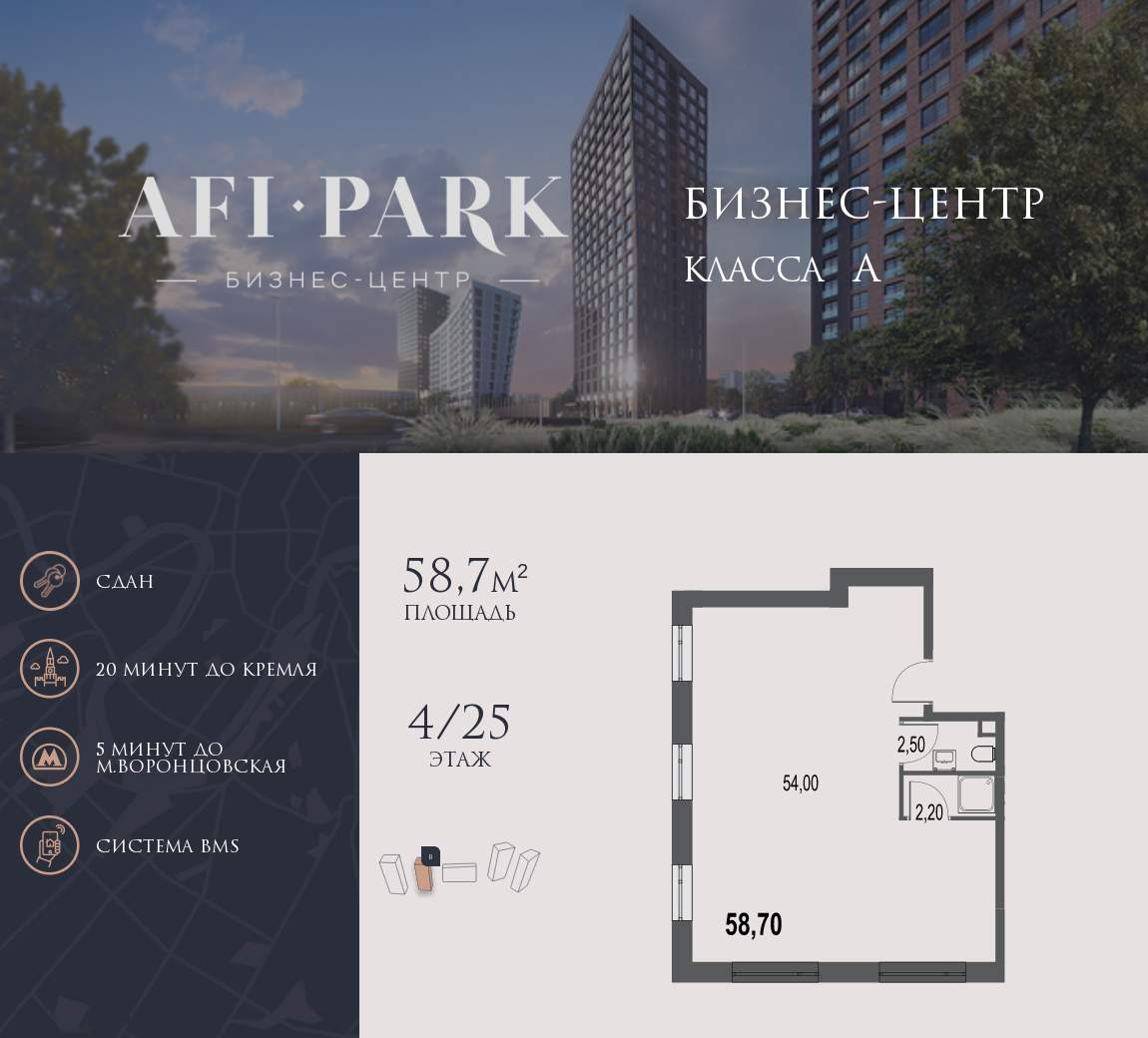 Продается просторное коммерческое помещение общей площадью 58,7 на 4 этаже в готовом бизнес-центре AFI Park. Строительство комплекса завершено.