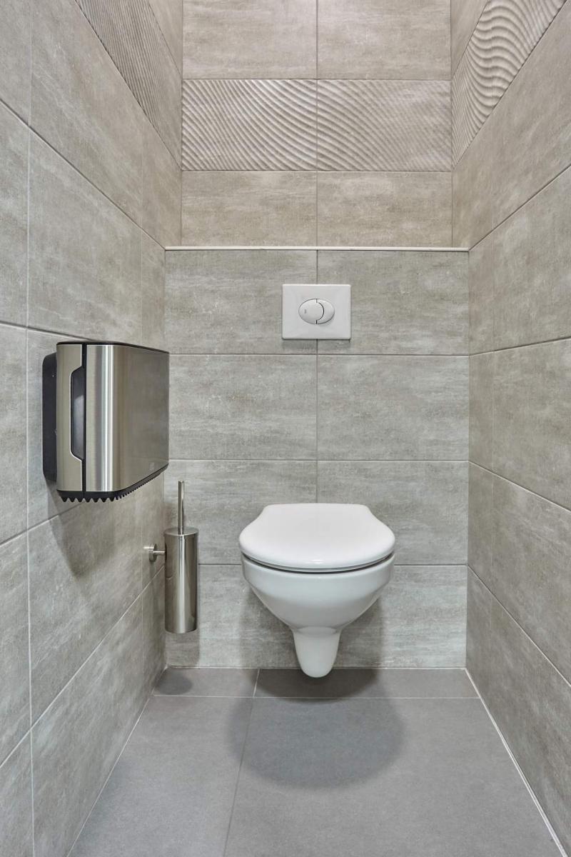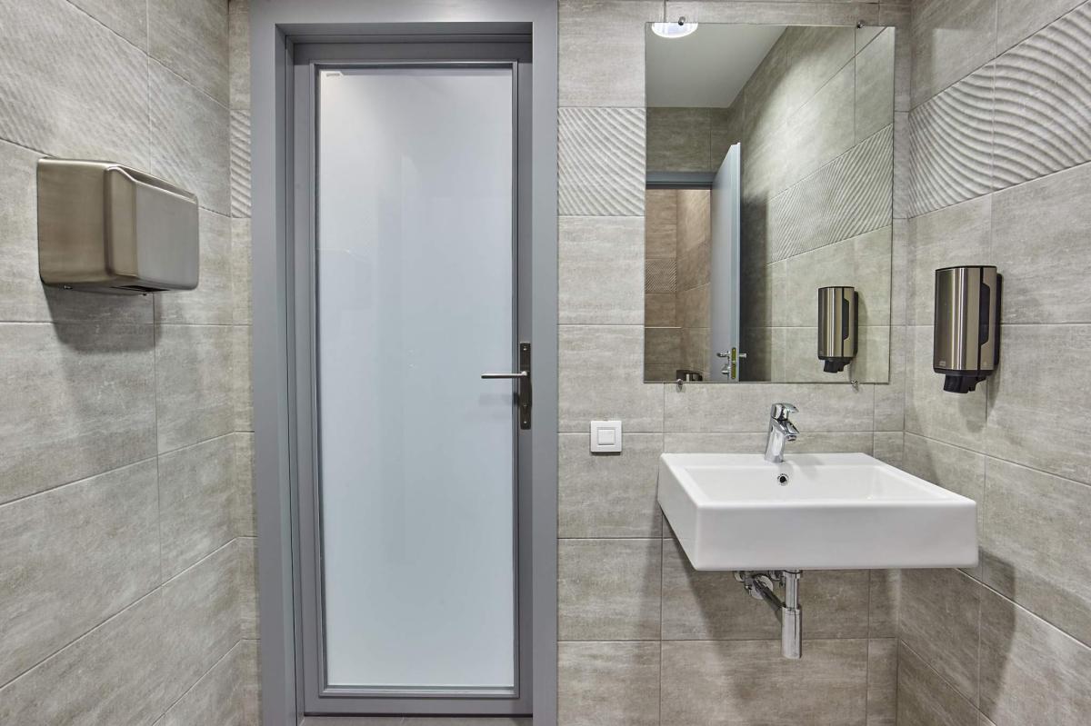Один просторный офис с перегородками + общий блок с туалетами.