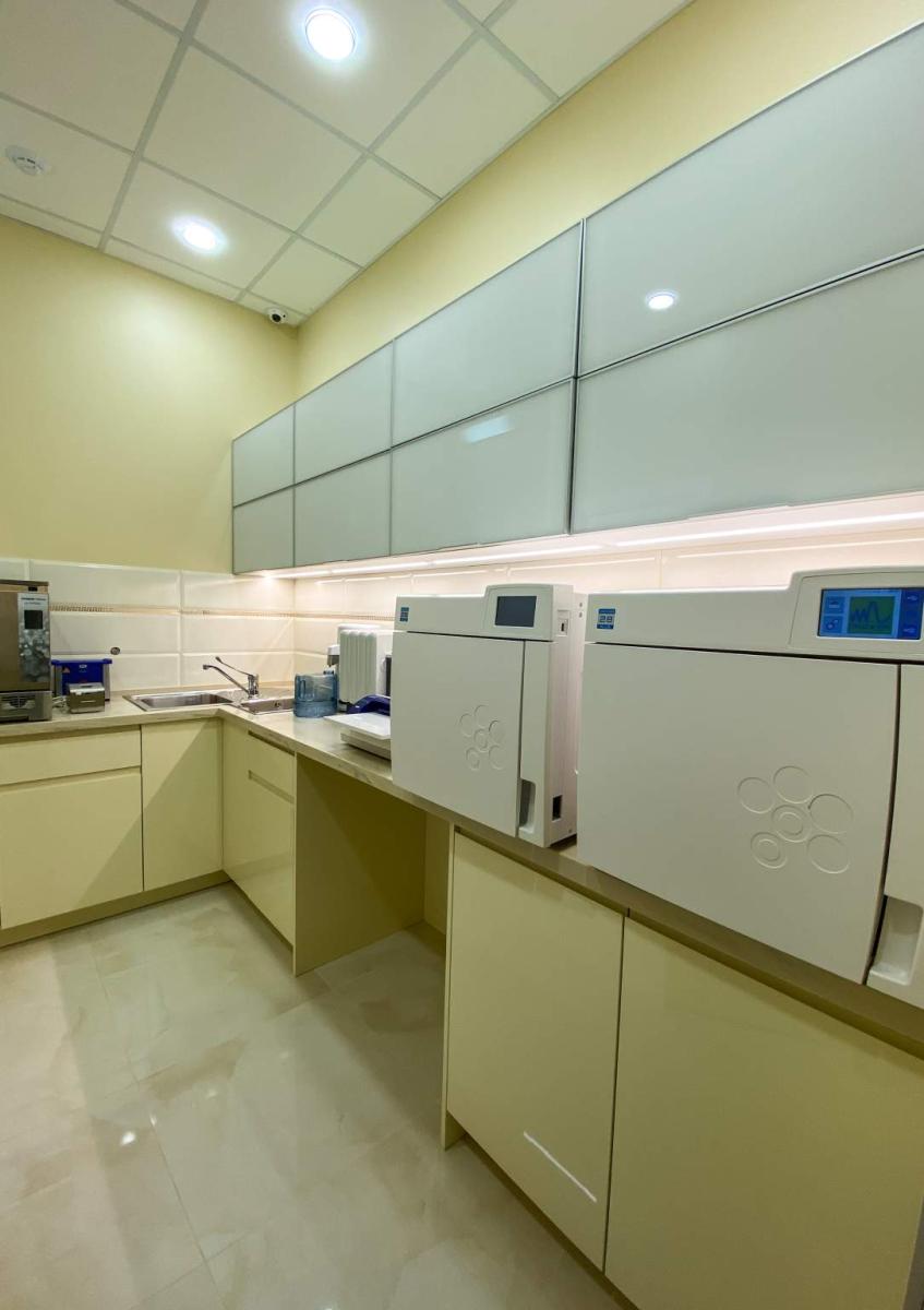 Профессиональное сертифицированное оборудование (стоматологические установки KaVo, операционный микроскоп, стерилизационная техника, моюще-дезинфицирующая машина Hydrim, полностью укомплектованный и защищённый рентген-кабинет с цифровым томографом KaVo с функцией 3D, аппаратура для ухода за инструментом, центр имеет серверное оборудование и соответствующее программное обеспечение, ИБП)