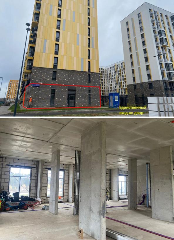 Помещение расположено в торце корпуса 1.1, рядом с входом на закрытую территорию. Дворовая территория комплекса благоустроена: предусмотрены зоны отдыха, детские и спортивные площадки, места для прогулок.