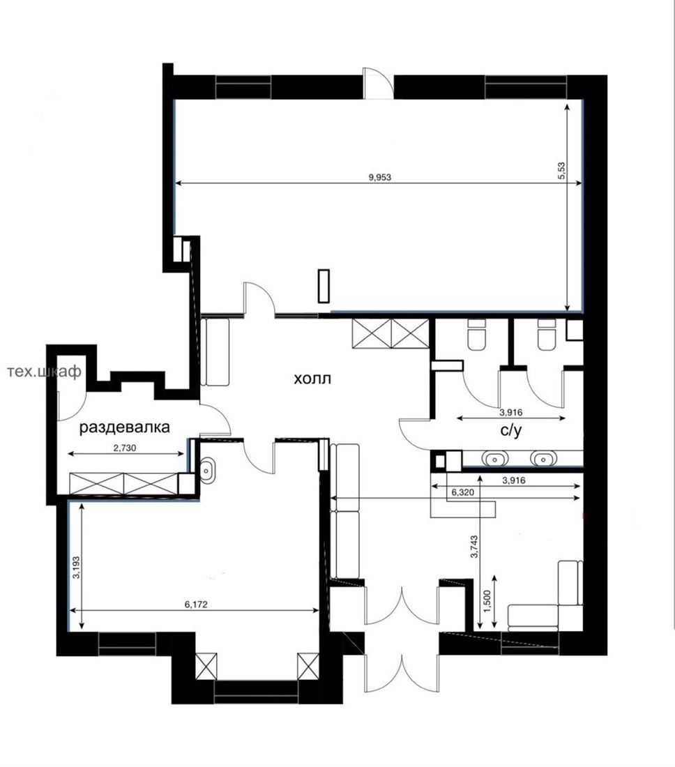 - санузел — 2 кабины с унитазом, раковина,
