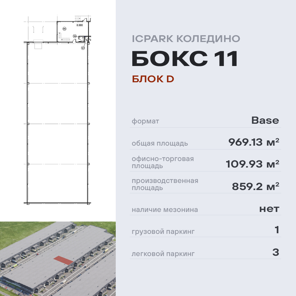 Планировочное решение включает в себя пространство для производства, склад или логистику 859,2 кв.м, а также офисную часть 109,93 кв.м.